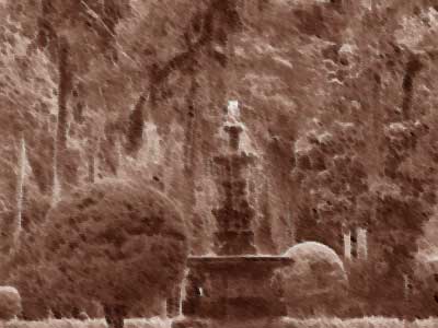 Fotografias. Água e terra. Entre o arvoredo observo as duas esculturas que estiveram tanto tempo separadas: