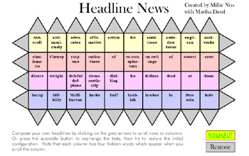 A base do jogo é um diagrama retangular dividido em 40 quadrados, cada quadrado com uma palavra dentro. Os lados dos quadrados que estão sobre o perímetro do retângulo formam triângulos equiláteros cinzentos (setas) que se situam fora do retângulo. Ao clicarmos nos triângulos ouve-se um ruído (muito bem escolhido!) que me sugere uma máquina de um cassino, embora eu nunca tenha ido a um cassino ! ;-). A cada clique as palavras mudam de lugar (scroll) e nos vem a esperança de formar uma manchete... Existem também a opção "scramble", que mistura todas as palalvras e então o desafio é voltar a estrutura inicial.