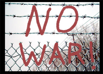 A imagem que serve de fundo ao poema revela uma paisagem escondida por um "muro-trincheira" de arame farpado onde se pode ler uma pichação cor de sangue: NO WAR. Semioticamente rica essa ilustração! Acredito que a maioria dos habitantes do Planeta Terra, mesmo que não entenda Inglês, ao visualisá-la vai perceber que se trata de um protesto e de um protesto