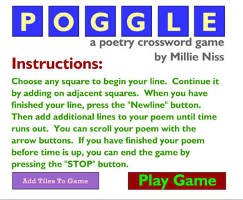 "Poggle" é um engenho - jogo para fazer poesia. Nós temos que escolher um quadrado para começar uma linha e para continuar o poema nós devemos clicar nos quadrados adjacentes ao quadrado escolhido. O desafio é que nós temos que escolher entre os oito quadrados adjacentes, aquele que melhor combina poeticamente com o primeiro quadrado. Temos que fazer isso durante um tempo determinado por uma ampulheta, a qual , certamente foi programada por Millie Niss. Não é fácil, principalmente para quem não possui um Inglês excelente como eu, por exemplo. Contudo é bem divertido e eu consegui fazer um poema do qual eu gostei: