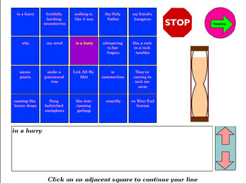 magino quanto tempo foi preciso para encontrar todas essas palavras e formar essas ilhas de sentido. É interessante também como até para quem não domina bem o Inglês o jogo poema convida e insiste e nos dá vontade de sempre clicar mais uma palavra para ver o que vai surgir. E nesse clicar existe sempre a esperança de se conseguir o "clique ideal" que faça com que as nove linhas do retângulo formem um texto com um sentido completo. E é isso que faz do poema um jogo, um desafio.