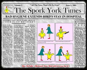 "O Sr. Spork disse ao nosso repórter que ele estava sendo penalizado por não escovar suas penas. A enfermeira que o ordenou para escovar estava ciente que pássaros não escovam as penas, e ainda assim ela insistiu que ele fizesse isso e conseguiu que o doutor ordenasse uma dose extra de medicamento quando ele recusou. Como todos devem estar cientes em nossa sociedade multi-étnica, pássaros se limpam tomando banhos de terra e tendo a ajuda de seus companheiros para catar piolhos com seus bicos. Obrigando o Sr. Spork a usar um pente ou escova o estariam forçando a suprimir a sua identidade de pássaro."
