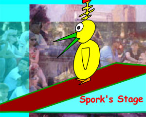 Neste contexto, uma das primeiras coisas que você nota é o humor. "Spork" é um nome engraçado, e o retrato de Spork no nível superior da "Home Page" é engraçado também - de olhos arregalados, aparentemente observando adiante e nos encarando como seu olhar fixo. Todavia existe a pequena animação na parte inferior da Home Page, intitulada "O Palco do Spork", que mostra Spork caminhando para cima e para baixo num tapete vermelho, aparentemente falando sem parar sem nunca parar ou olhar para o seu público. O texto abaixo nos informa que "Spork arrisca ser preso ou internado porque ele se dirige as massas de hippies e as pessoas sem casa em Washington Square Parque comentando sobre as condições do doente mental hoje. Ele não obteve uma licença para fazer um evento público e nem o seu tapete está dentro das medidas oficiais ..."