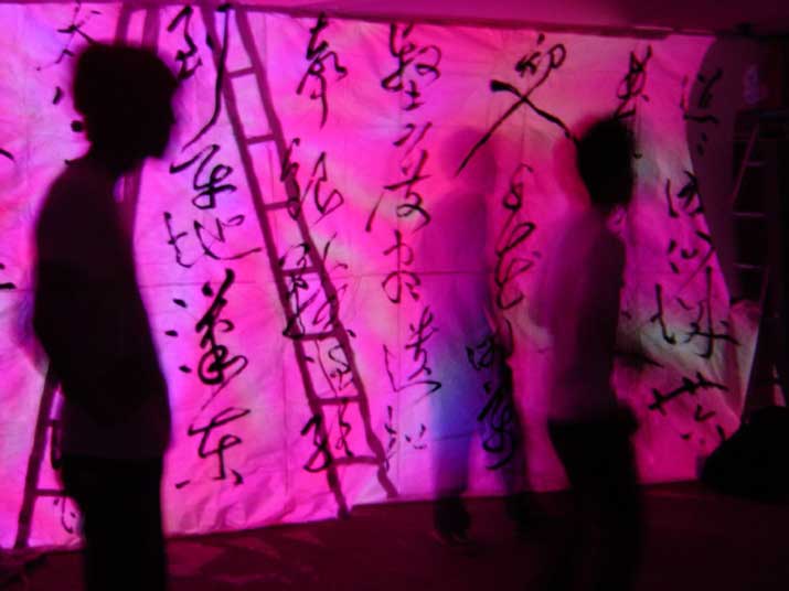 Calligraphy of the 7 treasures (gold, silver, pearls, agate, crystal, coral, lapis lazuli) as screen 4 video. Venue/Region : Embassy of Sweden - Tokyo - 2002 Eric Van Hove http://www.transcri.be Belgium