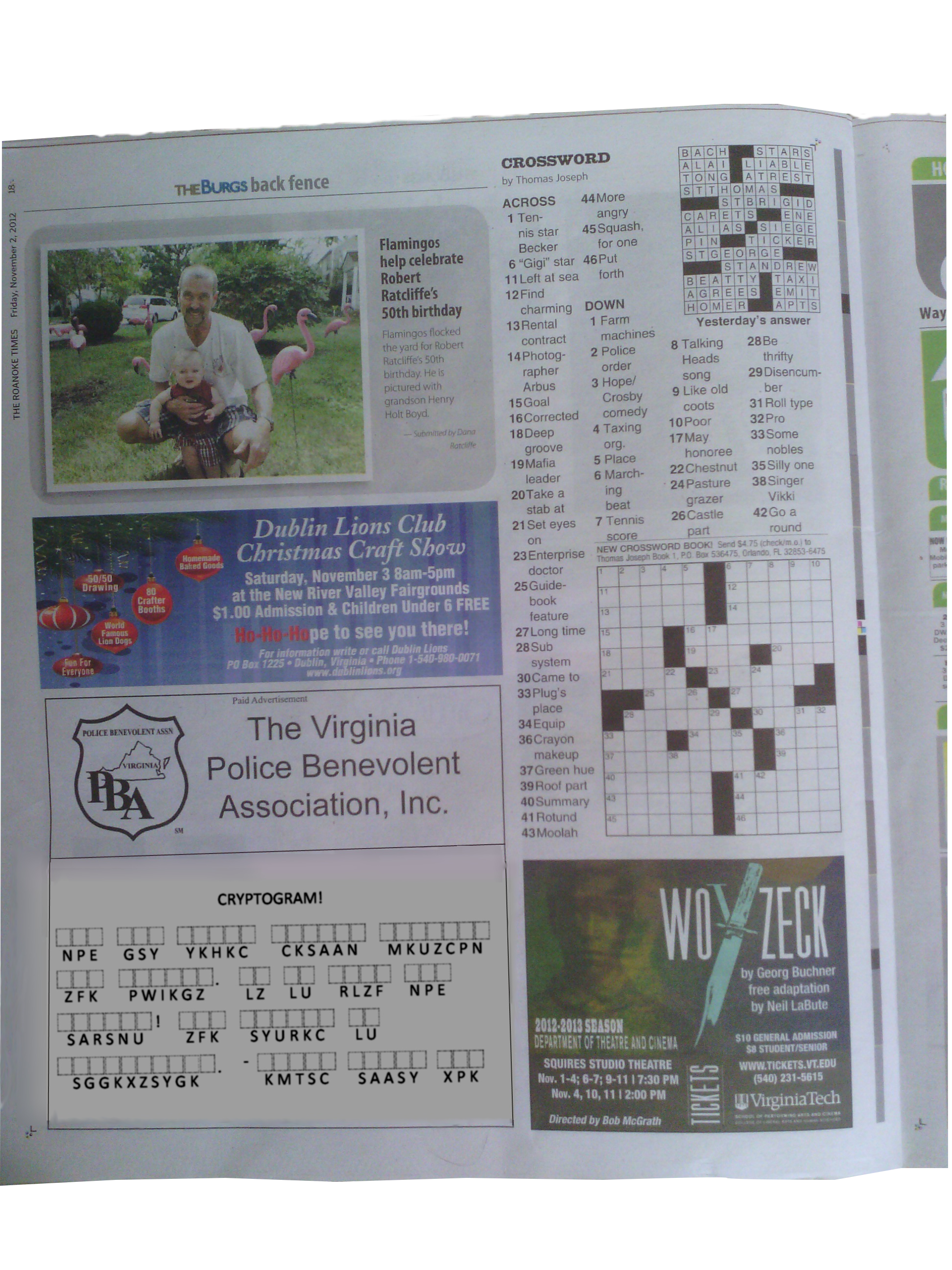 Yes! Your stapler is a perfect choice - it's sturdy, but small enough to be precise. You snatch it from your desk, put the cylinder on your bedside table, and smash the butt of the stapler into the red object. Surprisingly, the material is not as thick or difficult as you expected, instead it cracks apart quietly, carries in the air around the table and to the floor beneath. Perplexed by its fragility, you decide that you can't keep these pieces near you. You grab the nearest container - a tupperware container that held last week's work lunch - and you gather the red flakes and shove them inside. You shut the container as you run down the stairs. You fling open your front door, start to make your way toward your bike until you are stopped short by a hulking form standing in your way - it's your friend, Wallace. "Whoa, why are you in such a hurry?" Annoyed and impatient, you don't want to explain everything to Wallace; you're not even sure how you would. Luckily, Wallace is the sort of weird and loyal guy who will take you at your word. You make a flash decision. "I really need a favor, Wallace. I have to get rid of this container. I mean, I just can't have it near me anymore. Will you take it for me?" You shove the tupperware container in his direction and close your eyes against the sun blaring at you from over his shoulder. "Sure," he says, "No problem. Call me later, though, we need to set up our next game night." You feel the container leave your hand, and you open your eyes to see Wallace trotting back to his car. He turns around, jogs back to you with his hand extended. "I forgot - I got a new phone, new number. The new number's on my card." You take the card and go back inside, glad for the relief from the sun - it feels like your eyeballs are burning. Once inside, you already feel the relief of the object's absence, but you still need to seriously chill out. You know just the ticket - cryptograms, your favorite pasttime. You grab a nearby newspaper, turn to the puzzles page, and get to work. You're having a great time, even start to relax, until you start to realize the puzzle's solution. What in the world is going on here??