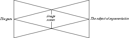 Here instead of standing in the position from where light is projected, as it is in the original model of perspective drawing, the subject is illuminated by the light projected from the object, the viewer/subject becomes, in essence, 'the screen'. On this screen according to Lacan, identity is negotiated. Negotiated between the imaginary and the symbolic, the image that the subject/viewer projects onto one side of the screen and on the other side the image of the subject/viewer as seen by the other/object. The screen is where the eye and the gaze meet.
