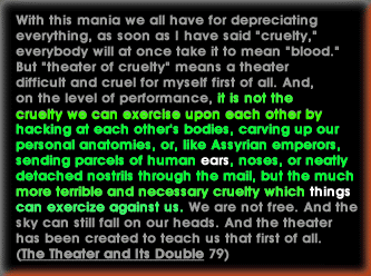 | We have heard--seen the spectacle/s--of Marx. And. The Br.others. But have we hear.d and see.n Artaud and Groucho?! Listen. To. Artaud, on the Theater of Cruelty: |