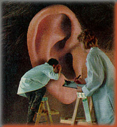 Faced.less with e.nor.mous dizzYness and Chirping in my ears, I went to see an Otolaryngologist! Who had mutiple tests run to e.liminate the big stuff. But first he looked into my Ears. () Thereafter, I had scans of my brain (the computer of the body). I had cold and warm water run through my ear canals (the gryoscope of the body). All was okay! But the moment of the sword of discovery came when the can.als disclosed to me that they were The organ of sight, not the eYes. The organ of balance determines what the eyes can see. Henceforth, I became a disorienter! A defamilEYEzer! I decided--as if I could decide anything in terms of my body w.riting!--to accept the Floaters and the Can.ards of my eYes as "the necessary and terrible cruelty which things can exercise against us." ... And the Laughter that should attend to such cruelty contra to and along side us! And so I went to an Acupunkturist! for Relief. Not only from the dizzyness but also the Chirping in my ears. An AcuPunkturist! Who stuck pins in my ears. So I could see normally! When I needed to, though I Laughed the Laughtear of the desire for .... Sub Liminaleyezation. Of the w.riting of the body; of the body, w.riting. And sow, I moved closer, yet further to see esse pierce and to VertoV...and became a seemiotician with a movie camEar, became a kino-Eye! |