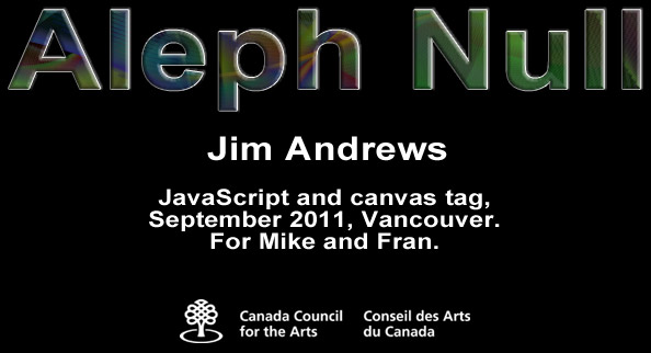 Creating Aleph Null has been part of a re-tooling process for me. From 1997 to 1999, I created work in DHTML. So I knew JavaScript a bit. But it was a very different beast at that point. The beast is now smarter and better behaved. From 1999 until last year, I used Macromedia Director (now Adobe Director) to create works such as Nio, Arteroids, On Lionel Kearns, A Pen, Jig-Sound, and dbCinema. But HTML 5 seems to be the way of the future. And it looks interesting. So I thought I'd try to learn JavaScript properly.