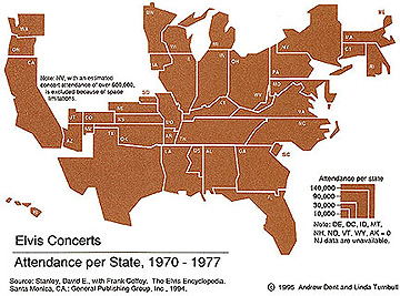 the concept of relative space was developed in geography and cartography during the 1960s. one of its main devices are cartograms, two dimensional representations of relative space. once again, the parameter that defines distance and space can be completely arbitrary. this map of the U.S., for example, is scaled according how many people in each state attended an elvis concert. |