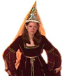 Laughs. Wearing nothing but her tall medieval hat, Joan scrambles up the carpeted stairs and slides