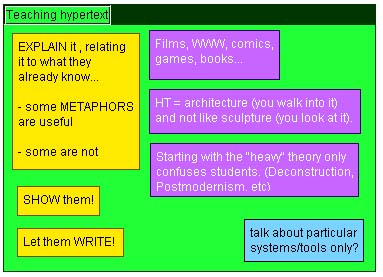 Finally, it was quite clear that the teaching issues were of such central importance, that they probably deserve a workhop of their own. Lecturers complained that it was very difficult to get students interested or enthusiastic about hypertext: they mostly don't understand the theory, or are frustrated by the lack of relationship between the existing theory and the hypertexts they see after reading it. We managed to put a few recommendations together for teachers of hypertext: