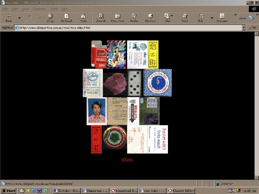 The Electronic Literature Organization describes Australian Jenny Weight, or rather, geniwate, as "a multimedia artist and writer" whose work has already earned significant critical attention her 1998 work of electronic long poetry, entitled "rice," won the trAce/Alt-X Hypertext Competition and her more recent composition Nepabunna was a finalist for the ELO's own 2001 poetry award. Online journal Riding the Meridian characterizes geniwate as a former writer of "conventional" poetry and practicing performance poet who turned to the Internet for new creative possibilities. "While it is sometimes hard to reconcile her current work to the poetry tradition," Meridian editor Jennifer Ley writes, "she still wishes to be a part of that tradition, to be challenging it rather than rejecting it." (Incidentally, geniwate embarked on a Ph.D. last year, but remains a committed electronic writer and "distance educationalist" at the University of South Australia.) Of the many issues that geniwate's "rice" reflects critically upon, of foremost concern is Vietnam's millenniums-old history of foreign subjugation and the transnational problematic of viewing one culture through the lens of another. The work itself—a deliberate and imaginative blend of influences, incorporating music, spoken poetry, photographs, digital images, animation, and acerbic textual commentary—brings into question the relationship between artist, tourist, and colonizer, and exposes the inevitable friction and occasional breakthroughs posed by crossing boundaries of country and media. Accompanied by vaguely Eastern-toned music—a repeating melody punctuated by seemingly urgent and at the same time ominous repeated staccato notes—"rice"'s prefatory splash page devotes itself to de rigueur "best viewing" recommendations, production acknowledgements, and contact information. These minutiae, set out in a no-nonsense red Arial font, underscore the dramatically spaced lowercase white letters of the title—fuzzy-edged, almost like chalk on a sidewalk or alleyway graffiti—all stark against a black background marked by the shadowy imprint of an off-center white grid: three unequally spaced parallel lines running vertically crossed by another three lines running horizontally. This suggestion of format unfolds on the following screen, which presents a table of roughly rectangular images arranged in a 4 x 4 pattern, altogether 16 different selectable options with no particular suggestion of order or correspondence (though each section is labeled and the numbering system starts at the top-left and moves left-to-right and top-to-bottom like the Western reading eye, with only one exception):